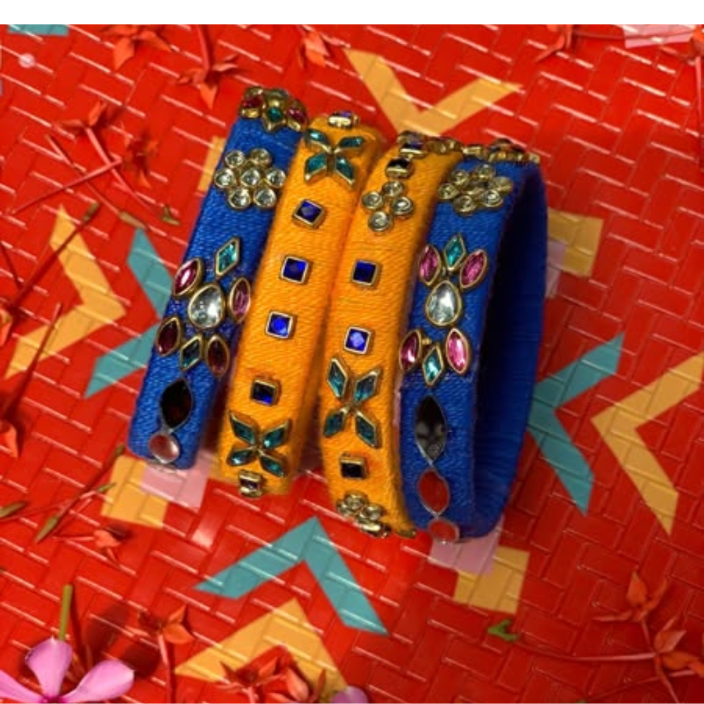 Add vibrant elegance to your collection with this Handmade Blue & Orange Silk Thread Bangle Set. Featuring a bold combination of royal blue and bright orange silk thread, these bangles are beautifully decorated with colorful stone embellishments in floral and geometric patterns.